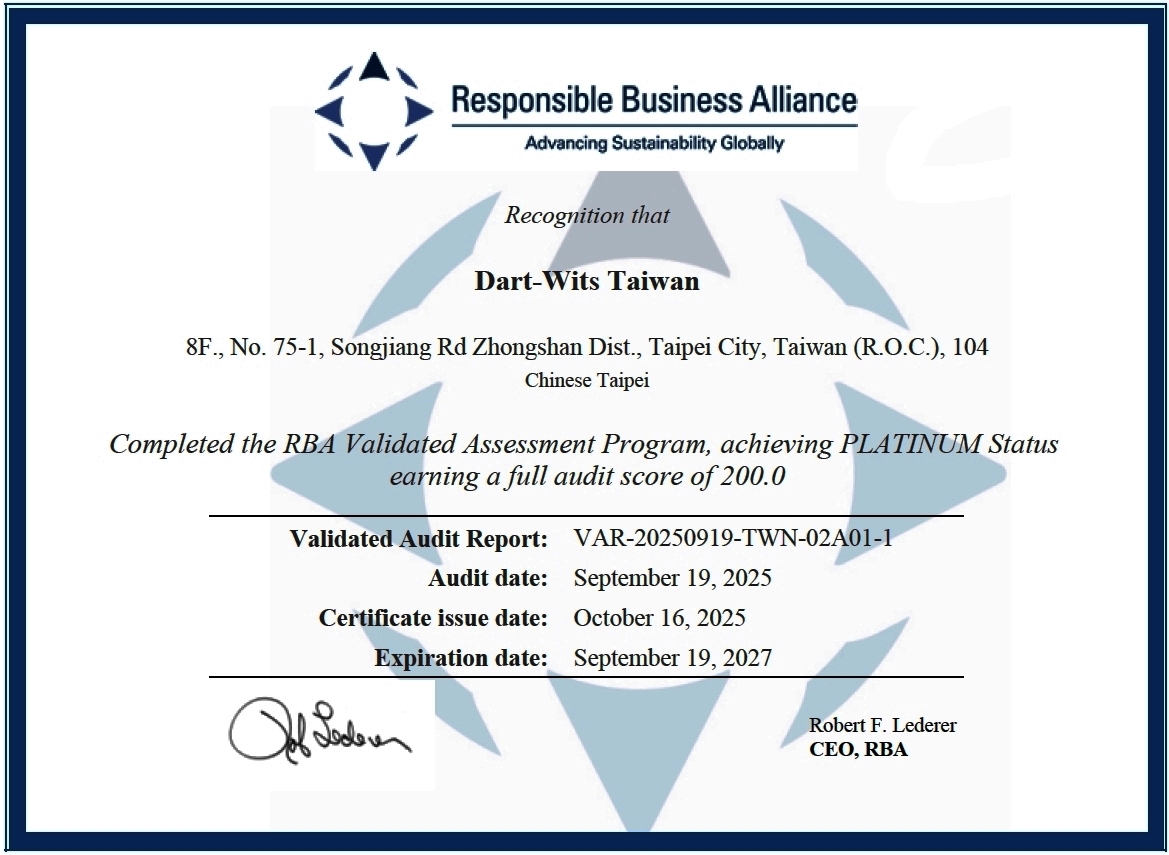 深耕台灣逾三十年的專業人力資源整合服務供應商——大智國際人力仲介有限公司(Dart-Wits Manpower),近日通過責任商業聯盟(Responsible Business Alliance, RBA) 之 Validated Assessment Program(VAP) 第三方稽核,並榮獲最高榮譽——「白金級(Platinum)」 認證。